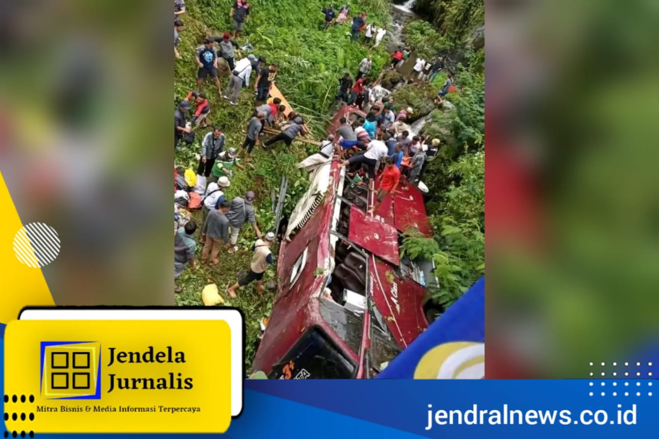 Satu bus dari rombongan tersebut melaju ke jurang dan jatuh ke sungai yang banyak terdapat bebatuan besar.