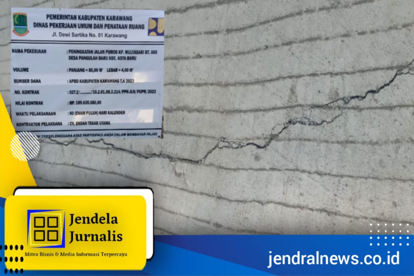 Peningkatan jalan poros Kampung Mulyasari RT. 005, Desa Pangulah Baru, Kecamatan Kotabaru, Kabupaten Karawang, Provinsi Jawa Barat yang dikerjakan oleh pihak CV. ENDAH TEGAR UTAMA dengan no kontrak : 027.2/…../10.2.01.08.3.214/PPK-JLN/PUPR 2023 sudah retak-retak.