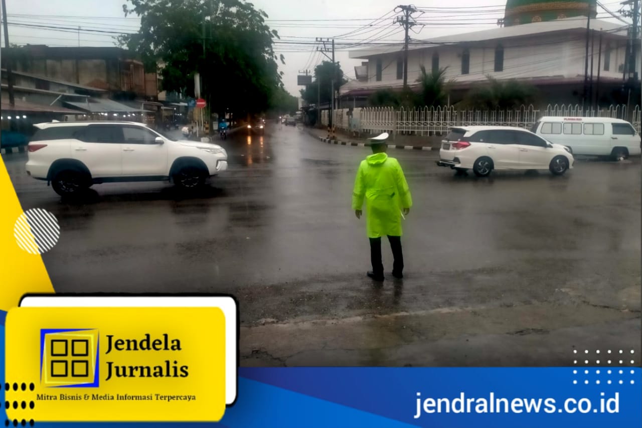 Kapolres Aceh Barat AKBP Andi Kirana S.I.K., M.H melalui Kasat Lantas Iptu Mardiansyah S.H mengatakan bahwa dengan menggunakan jeket hujan Personel Sat lantas Polres Aceh Barat tetap melakukan pengatur Arus Lalulintas di pagi hari.