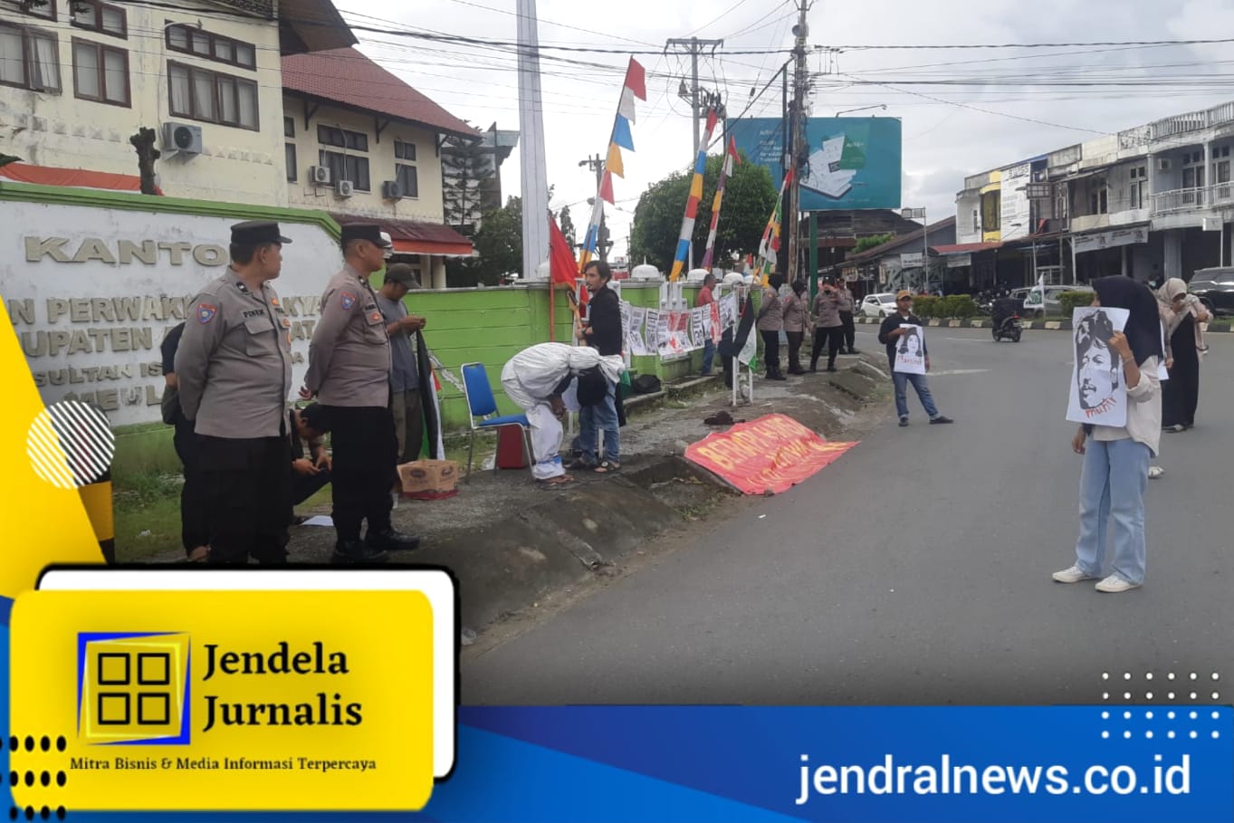 Puluhan Personel Polres Aceh Barat lakukan Pengamanan Aksi Damai dari Solidaritas Mahasiawa Untuk Rakyat (SMUR) dalam rangka Peringatan HAM sedunia bertempat di tugu simpang pelor depan kantor DPRK Aceh Barat, Minggu (10/12/2023) pukul 16.00 WIB.