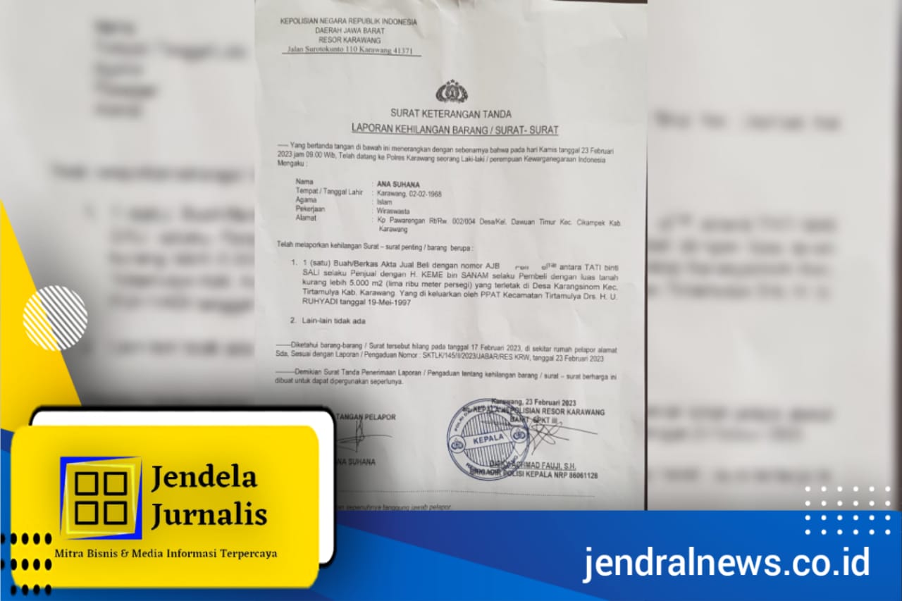 Surat akta jual beli (AJB) tanah tersebut hilang di rumah Ana Suhana yang beralamat di Kampung Pawarengan Rt 002/004 Desa Dawuan Timur, Kecamatan Cikampek Kabupaten Karawang.