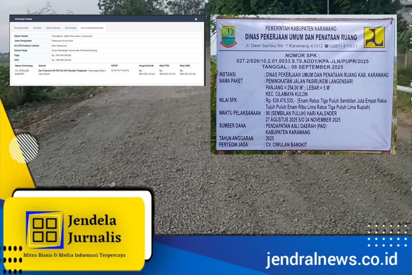 Jendela Jurnalis Karawang, JABAR – Peningkatan jalan Pasirukem-Langensari di kecamatan Cilamaya kulon yang dikerjakan oleh CV.CIWULAN BANGKIT dengan anggaran yang tertera di papan proyek senilai Rp.639.476.535 tidak sama dengan hasil akhir pengumuman pemenang tender LPSE kabupaten Karawang.