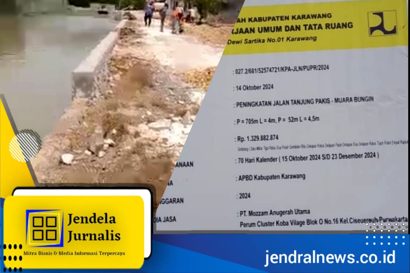 Diketahui, proyek yang berlokasi di Dusun Bungin. RT. 04/02, Desa Tanjungpakis, Kecamatan Pakisjaya, Karawang, Jawa barat tersebut dikerjakan oleh PT. Mozzam Anugrah Utama, dengan judul “PENINGKATAN JALAN TANJUNG PAKIS – MUARA BUNGIN” dengan volume P = 705 M, L = 4 M, P = 52 M, L = 4.5 M, dengan nilai anggaran sebesar Rp. 1.329.882.874,00,- (satu miliar tiga ratus dua puluh sembilan juta delapan ratus delapan puluh dua ribu delapan ratus tujuh puluh empat rupiah) yang bersumber dari APBD Kabupaten Karawang TA 2024.